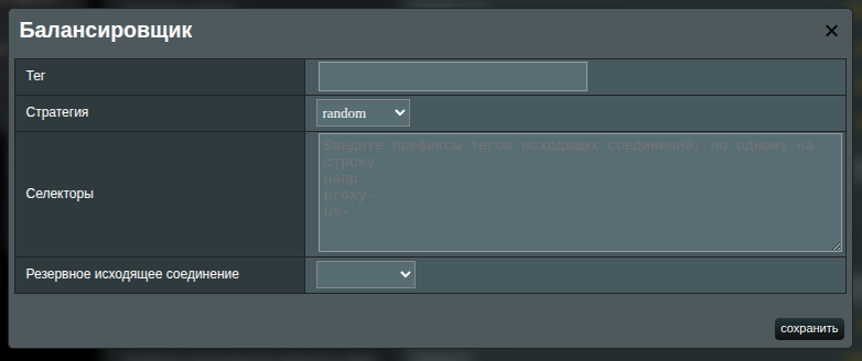 | Selectors | Префиксы для сопоставления тегов outbound. По одному на строку. |